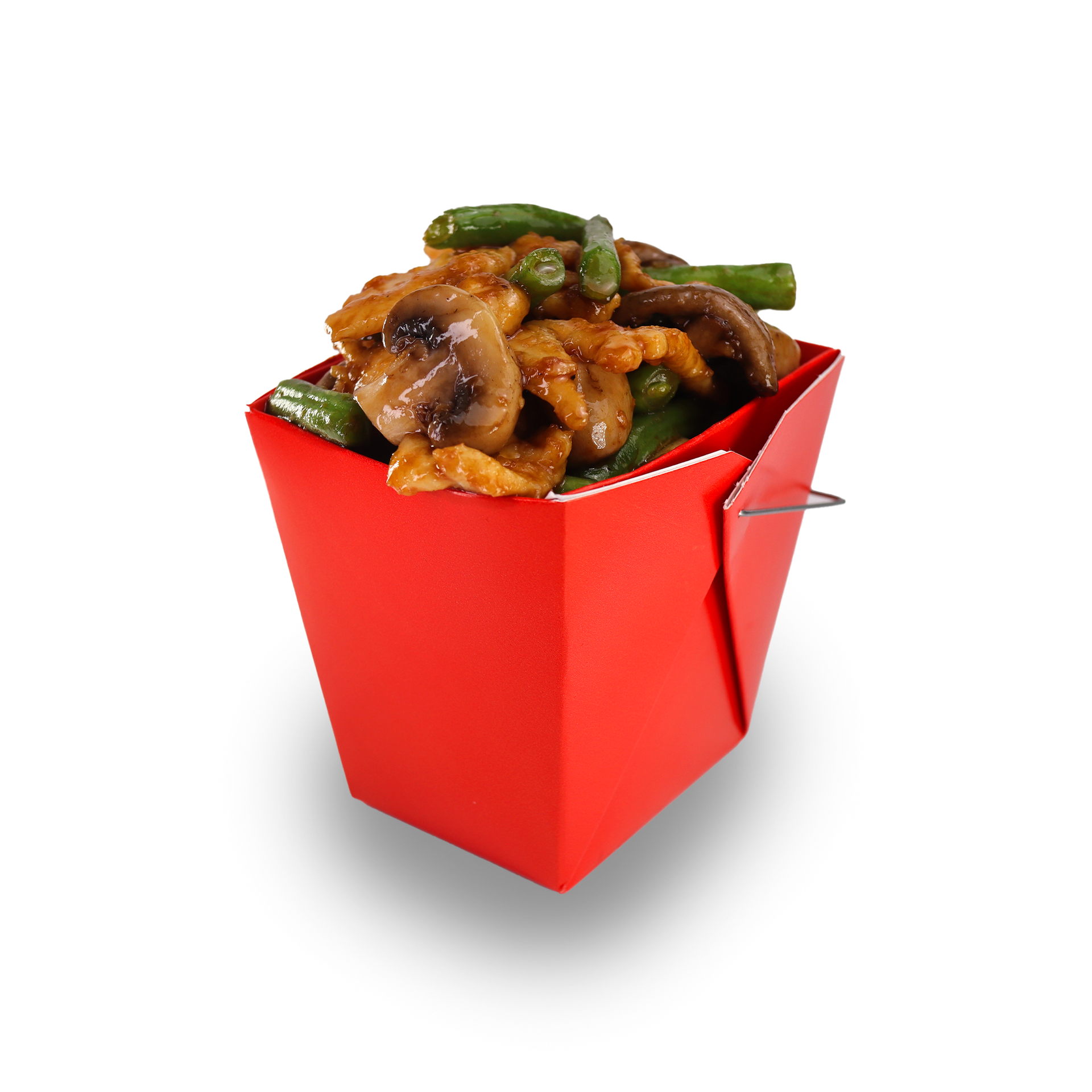 Tender chicken with delicious mushrooms and fresh, crispy green beans in a savory garlic sauce.